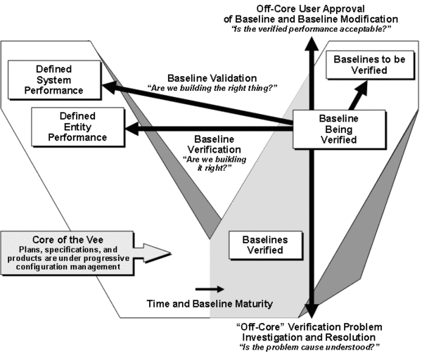 The vertical dimension of the entity vee is baseline elaboration at the selected architecture level and the core of the entity vee represents entity baseline elaboration progression. Also included (similar to the architecture vee) are the activities associated with opportunity and risk management, pursued downward and off-core to the level of detail necessary for issue evaluation and resolution. For example, laboratory test of a computer chip or of software code may be necessary to confirm technical feasibility. Unlike the commonly held view of the Waterfall Model, there is no prohibition against doing exploratory design and analysis at any point in the project cycle to investigate or prove performance or feasibility. Unlike the spiral model, the vee opportunity and risk investigations may be performed either in series or in parallel with the on-core development work, rather than being conducted sequentially and prior to the design development process. Hardware and software requirements-understanding models or technical feasibility models are encouraged early in the project cycle to pursue opportunities, such as new technologies, and to reduce risk. For instance, to evaluate a concept of a manual override versus full automation, technical feasibility of the two concepts could be modeled with selection based on response time versus cost. Customer confirmation could then provide valuable in-process validation of the preferred approach.
