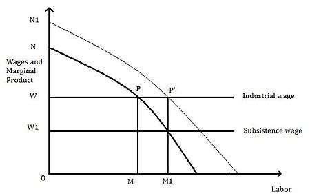 Since the wages in the capitalist sector depend on the earnings of the subsistence sector, capitalists would like to keep down productivity/wages in the subsistence sector, so that the capitalist sector may expand at a fixed wage. In the capitalist sector labor is employed up to the point where its marginal product equals wage, since a capitalist employer would be reducing his surplus if he paid labor more than he received for what is produced. But this need not be true in subsistence agriculture as wages could be equal to average product or the level of subsistence. The total product labor ONPM is divided between the payments to labor in the form of wages, OWPM, and the capitalist surplus, NPW. The growth of the capitalist sector and the rate of labor absorption from the subsistence sector depends on the use made of capitalist surplus. When the surplus is reinvested, the total product of labor will rise. The marginal product line shifts upwards to the right, that is to N1. Assuming wages are constant, the industrial sector now provides more employment. Hence employment rises by MM1. The amount of capitalist surplus goes up from WNP to WN1P'. This amount can now be reinvested and the process will be repeated and all the surplus labor would eventually be exhausted. When all the surplus labor in the subsistence sector has been attracted into the capitalist sector, wages in the subsistence sector will begin to rise, shifting the terms of trade in favor of agriculture, and causing wages in the capitalist sector to rise. Capital accumulation has caught up with the population and there is no longer scope for development from the initial source, i.e. unlimited supplies of labor. When all the surplus labor is exhausted, the supply of labor to the industrial sector becomes less than perfectly elastic. It is now in the interests of producers in the subsistence sector to compete for labor as the agricultural sector has become fully commercialized. It is the increase in the share of profits in the capitalist sector which ensures that labor surplus is continuously utilized and eventually exhausted. Real wages will tend to rise along with increases in productivity and the economy will enter into a stage of self-sustaining growth with a consistent nature.[6]