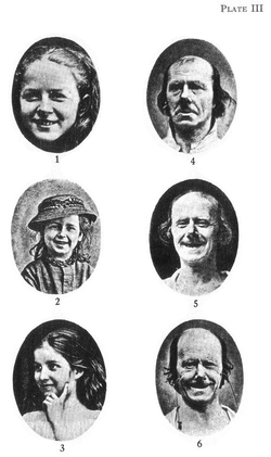 Duchenne used six living models in the scientific section, all but one of whom were his patients. His primary model, however, was an "old toothless man, with a thin face, whose features, without being absolutely ugly, approached ordinary triviality."[16] Through his experiments, Duchenne sought to capture the very "conditions that aesthetically constitute beauty."[17] He reiterated this in the aesthetic section of the book where he spoke of his desire to portray the "conditions of beauty: beauty of form associated with the exactness of the facial expression, pose and gesture."[18] Duchenne referred to these facial expressions as the "gymnastics of the soul". He replied to criticisms of his use of the old man by arguing that "every face could become spiritually beautiful through the accurate rendering of his or her emotions",[18] and furthermore said that because the patient was suffering from an anesthetic condition of the face, he could experiment upon the muscles of his face without causing him pain.