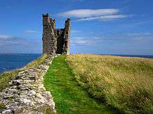 In 1550 the Warden of the Middle and Eastern Marches, Sir Robert Bowes, described Dunstanburgh as being "in wonderfull great decaye".[1] A report in 1584 suggested that it would cost Queen Elizabeth I £1,000 to restore the castle, but argued that it was too far from the Scottish border to be worth repairing.[42] Alice Craster, a wealthy widow, occupied the castle from 1594 to 1597, probably living in the gatehouse, where she carried out restoration work, and farming the surrounding estate.[43] For much of the 16th century, local farmers bought the right to use the outer bailey of the castle to store their cattle in the event of Scottish raids, at the price of six pence a year.[44]