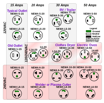 NEMA receptacles, with their common US uses listed (in purple text)