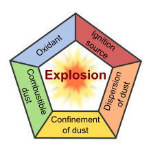 This traditional diagram shows five requirements for a dust explosion, though only four are technically required; see text