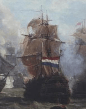 ![]() The ship Admiraal Tjerk Hiddes de Vries during the Battle of Camperdown. | |