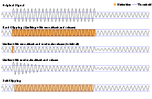 Limiting and clipping compared. Note that clipping introduces a large amount of distortion whereas limiting only introduces a small amount while keeping the signal within the threshold.