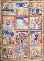 These pages "contain by far the largest New Testament cycle produced in England or anywhere else in the 12th century", with some 150 scenes.[47] The emphasis on the miracles and parables of Christ was most untypical in Romanesque cycles in general, which concentrated almost exclusively on the events commemorated by the feast days of the liturgical calendar. Ottonian cycles such as that in the Codex Aureus of Echternach still show the miracles and parables, but the cycle here has more scenes than any Ottonian one. Sources for the selection of scenes are probably considerably older than the 12th century, and might possibly go back as far as the St Augustine Gospels, of about 600, which were then at Canterbury, and no doubt more complete than now, or a similar very early cycle.[48]