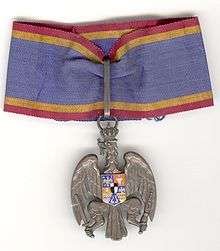 The Honorific Sign "The Eagle of Romania" (Semnul onorific "Vulturul României") is a special decoration, part of the National Decorations System, awarded to Romanian Parliamentarians, members of the Senate or of the Chamber of Deputies. It also can be awarded to foreign parliamentarians for its special contribution in the development of parliamentarian relations with Romania.[1][2]