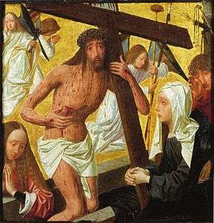Marian devotion grew from the 13th century, mostly forming around the concepts of the Immaculate Conception and her Assumption into heaven. In a culture that venerated the possession of relics as a means to bring the earthly closer to the divine, Mary left no bodily relics, thus assuming a special position between heaven and humanity.[96] By the early 15th century, Mary had grown in importance within the Christian doctrine to the extent that she was commonly seen as the most accessible intercessor with God. It was thought that the length each person would need to suffer in limbo was proportional to their display of devotion while on earth.[97] The veneration of Mary reached a peak in the early 15th century, an era that saw an unending demand for works depicting her likeness. From the mid-15th century, Netherlandish portrayals of the life of Christ tended to be centred on the iconography of the Man of Sorrows.[94]