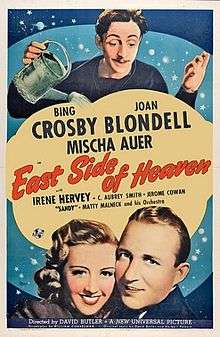 East Side of Heaven is a 1939 American musical film directed by David Butler and written by William M. Conselman and James V. Kern. The film stars Bing Crosby, Joan Blondell, Mischa Auer, Irene Hervey, C. Aubrey Smith, Robert Kent and Jerome Cowan.[1][2] Filming took place in Hollywood from January 13 to March 7, 1939. The film was released on April 7, 1939, by Universal Pictures and had its New York premiere at Radio City Music Hall on May 4, 1939.[3] This was another independent production in which Crosby had a financial interest.
