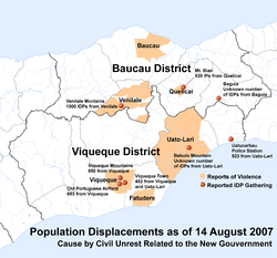 On 10 August, a convent in Baucau was attacked and damaged, and a number of female students at the convent were said to have been raped. The government said that a child had been killed in Viqueque, the first death to be reported in the unrest.[32] On 11 August, a UN convoy of three vehicles was attacked between Baucau and Viqueque. According to FRETILIN, this attack was the result of the destruction by members of the UN force of banners and flags used by protesters.[33]