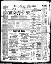 The Observer was first published in 1906 using equipment bought from the The Border Post, and Wodonga Advertiser, an Albury newspaper which had ceased operation in 1902.[1][2] It was also titled The Henty observer and Culcairn Shire register and Shire's observer.[1] The press moved a number of times in Henty until, after a fire destroyed its premises in 1933, a new building was constructed. The paper continued to be based from this building until 2008, when it was converted to a museum.[2][3] In 1981 it changed name to the Eastern Riverina Observer and remained in publication under this title until 2003.[4]