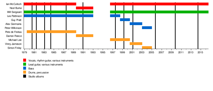Immediately prior to the release of the band's next album, What Are You Going to Do with Your Life? (1999), Les Pattinson quit to take care of his mother.[17] McCulloch and Sergeant have continued to tour and record as Echo & the Bunnymen, touring repeatedly and releasing the albums Flowers (2001), Siberia (2005), The Fountain (2009) and Meteorites (2014). The Siberia band line up was Ian McCulloch, Will Sergeant, Paul Fleming (keyboards), Simon Finley (drums) and Pete Wilkinson (bass), Hugh Jones produced Siberia after previously engineering early Bunnymen albums. Since August 2009 the group's touring incarnation has comprised McCulloch and Sergeant along with Stephen Brannan (bass), Gordy Goudie (guitar), Nicholas Kilroe (drums) and Jez Wing (keyboards).