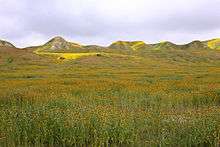 California's Central Valley was once a large temperate grassland containing native bunchgrasses and vernal pools.[12] Grizzly bear, gray wolf, tule elk, and pronghorn antelope used to inhabit the grasslands.[13] The native grasslands and pools have now been largely replaced by livestock ranches and farms.[14] The Carrizo Plain, where the native grass is preserved, is referred to as the "Serengeti of California".[15]