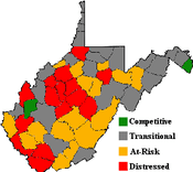 The Appalachian Regional Commission was formed in 1965 to aide economic development in the Appalachian region, which was lagging far behind the rest of the nation on most economic indicators. The Appalachian region currently defined by the Commission includes 420 counties in 13 states, including all 55 counties in West Virginia, the only state whose entire territory is covered by the Appalachian Regional Commission. The Commission gives each county one of five possible economic designations— distressed, at-risk, transitional, competitive, or attainment— with "distressed" counties being the most economically endangered and "attainment" counties being the most economically prosperous. These designations are based primarily on three indicators— three-year average unemployment rate, market income per capita, and poverty rate.[47]