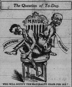 Editorial cartoon about the February 1912 Edmonton mayoral election on the February 16, 1912 issue of the Edmonton Bulletin