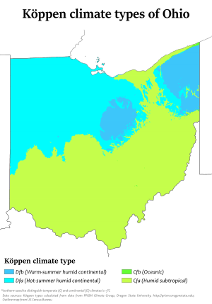 The climate of Ohio is a humid continental climate (Köppen climate classification Dfa/Dfb) throughout most of the state except in the extreme southern counties of Ohio's Bluegrass region section which are located on the northern periphery of the humid subtropical climate (Cfa) and Upland South region of the United States. Summers are typically hot and humid throughout the state, while winters generally range from cool to cold. Precipitation in Ohio is moderate year-round. Severe weather is not uncommon in the state, although there are typically fewer tornado reports in Ohio than in states located in what is known as the Tornado Alley. Severe lake effect snowstorms are also not uncommon on the southeast shore of Lake Erie, which is located in an area designated as the Snowbelt.