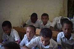 Following the outbreak of the Somali Civil War in 1991, the task of running schools in Somalia was initially taken up by community education committees established in 94% of the local schools.[1] Numerous problems had arisen with regard to access to education in rural areas and along gender lines, quality of educational provisions, responsiveness of school curricula, educational standards and controls, management and planning capacity, and financing. To address these concerns, the Puntland government is in the process of developing an educational policy to guide the region's scholastic process as it embarks on the path of reconstruction and economic development. The latter includes a gender sensitive national education policy compliant with world standards, such as those outlined in the Convention on the Rights of the Child (CRC) and the Convention on the Elimination of All Forms of Discrimination against Women (CEDAW).[2] Examples of this and other educational measures at work are the government's enactment of legislation aimed at securing the educational interests of girls,[3] promoting the growth of an Early Childhood Development (ECD) program designed to reach parents and care-givers in their homes as well as in the ECD centers for 0-5 year old children,[4] and introducing incentive packages to encourage teachers to work in remote rural areas.[5]