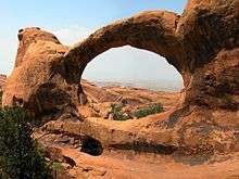 In 1956 and 1957, Abbey worked as a seasonal ranger for the United States National Park Service at Arches National Monument (now a national park), near the town of Moab, Utah. Abbey held the position from April to September each year, during which time he maintained trails, greeted visitors, and collected campground fees. He lived in a house trailer that had been provided to him by the Park Service, as well as in a ramada that he built himself. During his stay at Arches, Abbey accumulated a large volume of notes and sketches which later formed the basis of his first non-fiction work, Desert Solitaire.[15] Abbey's second son Aaron was born in 1959, in Albuquerque, New Mexico.[16]
