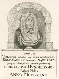 Hungerford obtained some reputation as a patron of archery, and was lieutenant-colonel of the Regiment of Archers in 1661, and colonel in 1682. However, he was best known for his reckless extravagance. He is said to have disposed of thirty manors in all. By way of restoring his waning fortunes, he obtained permission in 1679 to hold a market, on Mondays, Wednesdays, and Saturdays on the site of the demolished Hungerford House and grounds. The house, which stood on the site of the present Charing Cross railway station, had been his family's London town house and had been destroyed by fire in April 1669.[7]).[4] In 1682 a market-house was erected there, apparently to the design of Sir Christopher Wren. A bust of Sir Edward was placed on the north front, with an inscription stating that the market had been built at his expense with the king's sanction.[8] In 1685 Sir Stephen Fox and Sir Christopher Wren purchased the market and received the tolls. The market-house was rebuilt in 1833, and was removed in 1860, when Charing Cross railway station was built on the site,[9] Hungerford sold the manor and his seat at Farleigh Castle in 1686 to Henry Baynton of Spye Park for £56,000,[10] so ending centuries of ownership by the Hungerford family. In about 1700 it was purchased by Joseph Houlton of Trowbridge, in the possession of whose descendants it remained until July 1891, when it was bought by Lord Donington.[4]