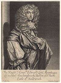 Edward Montagu, 2nd Earl of Sandwich (3 January 1647/48 – 29 November 1688)[1] was born in Hinchinbrooke, Huntingdonshire, England to Edward Montagu, 1st Earl of Sandwich and Jemima Crew. He was styled Viscount Hinchingbrooke from 1660 until his accession in 1672. He was educated mainly in Paris, where he lived with his cousin Walter Montagu, although he is said "not to have been much of a scholar". He married Lady Anne Boyle, daughter of Richard Boyle, 2nd Earl of Cork and Elizabeth Clifford, 2nd Baroness Clifford. They had three children Edward Montagu, 3rd Earl of Sandwich, Richard Montagu and Elizabeth Montagu. Anne died in 1671. Their eldest son was insane: there is no evidence that the condition was hereditary, although the first Earl seems to have suffered from depression in his later years.