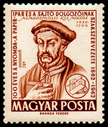 Miklós Kis, a Transylvanian Protestant priest and schoolteacher, became deeply interested in printing after being sent to Amsterdam to help print a Hungarian Protestant translation of the Bible.[2][3] This was a period of considerable prosperity for the Netherlands and a time when its styles of printing were very influential across Europe, making it a centre for the creation of new typefaces.[4][5][6] He developed a second career as a punchcutter, an engraver of the punches used as a master for making moulds for metal type, working on commission for printers and governments. Kis returned to Transylvania around 1689 and may have left matrices (the moulds used to cast type) in Leipzig on his way home.[7] The Ehrhardt type foundry of Leipzig released a surviving specimen sheet of them around 1720.[8][9]