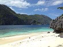 A 4 kilometer stretch of powdery white sand and pristine azure waters which is 15 minutes away from downtown El Nido through a tricycle. The unperturbed solace of this paradise will make you lose track of time.[50]