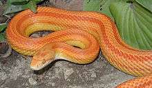 The corn snake (Pantherophis guttatus) is a North American species of rat snake that subdues its small prey by constriction.[4][5] It is found throughout the southeastern and central United States. Their docile nature, reluctance to bite, moderate adult size, attractive pattern, and comparatively simple care make them popular pet snakes. Though superficially resembling the venomous copperhead and often killed as a result of this mistaken identity, corn snakes are harmless and beneficial to humans.[6] Corn snakes lack venom and help control populations of wild rodent pests that damage crops and spread disease.[7]