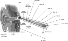 The basilar membrane and the hair cells of the cochlea function as a sharply tuned frequency analyzer.[2] Sound is transmitted to the inner ear via vibration of the tympanic membrane, leading to movement of the middle ear bones (malleus, incus, and stapes). Movement of the stapes on the oval window generates a pressure wave in the perilymph within the cochlea, causing the basilar membrane to vibrate. Sounds of different frequencies vibrate different parts of the basilar membrane, and the point of maximal vibration amplitude depends on the sound frequency.[3]