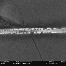 The phenomenon of electromigration has been known for over 100 years, having been discovered by the French scientist Gerardin.[1] The topic first became of practical interest in 1966 when the first integrated circuits became commercially available. The first observation of electromigration in thin films was made by I. Blech.[2] Research in this field was pioneered by a number of investigators throughout the fledgling semiconductor industry. One of the most important engineering studies was performed by Jim Black of Motorola, after whom Black's equation is named.[3] At the time, the metal interconnects in ICs were still about 10 micrometres wide. Currently interconnects are only hundreds to tens of nanometers in width, making research in electromigration increasingly important.