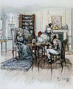 In 1850 the Gaskells moved to a villa at 84 Plymouth Grove,[5] where Elizabeth wrote her remaining literary works, while her husband held welfare committees and tutored the poor in his study. The Gaskells' social circle included writers, religious dissenters and social reformers such as William and Mary Howitt. Charles Dickens and John Ruskin visited Plymouth Grove, as did the American writers Harriet Beecher Stowe and Charles Eliot Norton, while the conductor Charles Hallé, who lived close by, taught piano to one of their daughters. Her close friend Charlotte Brontë stayed there three times, and on one occasion hid behind the drawing room curtains as she was too shy to meet the Gaskells' other visitors.[6]