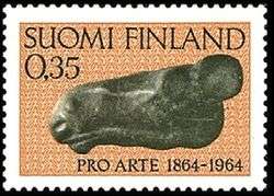 Elk's Head of Huittinen (Finnish: Huittisten hirvenpää, also known as Moose's Head) is a Mesolithic moose head figurine of soapstone found in 1903 from Huittinen in the province of Satakunta, Finland. The sculpture is dated to between 8,000 and 9,000 years ago. It is placed in the permanent exhibition of National Museum of Finland in Helsinki.[1] Replicas are displayed in the Museum of Huittinen[2] and in the sculpture collection of University of Helsinki.[3] Elk's Head is most likely the best-known archaeological artifact in Finland.