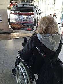 There are 36 passenger gondolas, of which 34 are in use at any one time, with a maximum capacity of 10 passengers each.[22] All passenger gondolas are ready for disabled persons using wheelchairs, including those ones with leg rest extensions. There are also two (open) engineers' gondolas for use by maintenance staff.