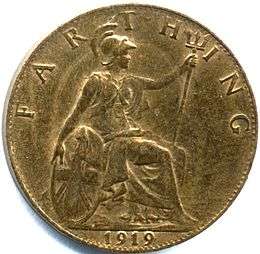 The British farthing (¼d) coin, from "fourthing", was a unit of currency of one quarter of a penny, or one nine hundred and sixtieth of a pound sterling. It was minted in bronze, and replaced the earlier copper farthings. It was used during the reign of six monarchs: Victoria, Edward VII, George V, Edward VIII, George VI and Elizabeth II, ceasing to be legal tender in 1960. It featured two different designs on its reverse during its one hundred years in circulation: from 1860 until 1936, the image of Britannia; and from 1937 onwards, the image of a wren. Like all British coinage, it bore the portrait of the monarch on the obverse.[1]