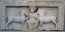 Sculptures of Epona fall into five types, as distinguished by Benoît: riding, standing or seated before a horse, standing or seated between two horses, a tamer of horses in the manner of potnia theron and the symbolic mare and foal. In the Equestrian type, common in Gaul, she is depicted sitting side-saddle on a horse or (rarely) lying on one; in the Imperial type (more common outside Gaul) she sits on a throne flanked by two or more horses or foals.[21] In distant Dacia, she is represented on a stela (now at the Szépmüvézeti Museum, Budapest) in the format of Cybele, seated frontally on a throne with her hands on the necks of her paired animals: her horses are substitutions for Cybele's lions.