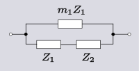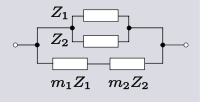 A single impedance has two terminals to connect to the outside world, hence can be described as a 2-terminal, or a one-port, network. Despite the simple description, there is no limit to the number of meshes,[note 6] and hence complexity and number of elements, that the impedance network may have. 2-element-kind[note 4] networks are common in circuit design; filters, for instance, are often LC-kind networks and printed circuit designers favour RC-kind networks because inductors are less easy to manufacture. Transformations are simpler and easier to find than for 3-element-kind networks. One-element-kind networks can be thought of as a special case of two-element-kind. It is possible to use the transformations in this section on a certain few 3-element-kind networks by substituting a network of elements for element Zn. However, this is limited to a maximum of two impedances being substituted; the remainder will not be a free choice. All the transformation equations given in this section are due to Otto Zobel.[4]