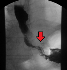 The first and the most common symptom is usually difficulty in swallowing, which is often experienced first with solid foods and later with softer foods and liquids.[2] Pain when swallowing is less usual at first.[2] Weight loss is often an initial symptom in cases of squamous-cell carcinoma, though not usually in cases of adenocarcinoma.[14] Eventual weight loss due to reduced appetite and undernutrition is common.[15] Pain behind the breastbone or in the region around the stomach often feels like heartburn. The pain can frequently be severe, worsening when food of any sort is swallowed. Another sign may be an unusually husky, raspy, or hoarse-sounding cough, a result of the tumor affecting the recurrent laryngeal nerve.