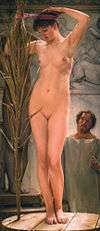 The sculpture inspired many artistic reconstructions in the decade after its discovery. Chief among these are Sir Lawrence Alma-Tadema's A Sculptor's Model (1877) and Edward Poynter's Diadumene (1884).[8] These both portrayed the statue's model binding her hair with a strip of fabric (as with the statue type diadumenos) in preparation for modelling for the sculptor or for taking a bath respectively. Poynter believed this to be the correct reconstruction partly because the remains of the little finger of her left hand are visible on the back of her head, suggesting that her left arm was raised to hold her hair in place, whilst the right hand wound the fabric. At the Museo Centrale Montemartini, the Esquiline Venus is now usually displayed behind a 'pool' (actually a glass floor panel) in tribute to this rendering.