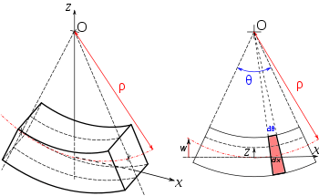 Let be the length of an element of the neutral surface in the undeformed state. For small deflections, the element does not change its length after bending but deforms into an arc of a circle of radius . If is the angle subtended by this arc, then .