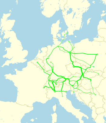 The EuroCity label replaced the older Trans Europ Express (TEE) name for border-crossing trains in Europe. Whereas TEE services were first-class only, EuroCity trains convey first and second class coaches.[2] The EuroCity schedule was designed with train pairs running one train in both directions, thus resulting in a more frequent service than the TEE, which normally ran only once a day.