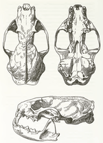 As a species, the American mink represents a more specialized form than the European mink in the direction of carnivory, as indicated by the more developed structure of the skull.[5] Fossil records of the American mink go back as far as the Irvingtonian, though the species is uncommon among Pleistocene animals. Its fossil range corresponds with the species' current natural range. The American minks of the Pleistocene did not differ much in size or morphology from modern populations, though a slight trend toward increased size is apparent from the Irvingtonian through to the Illinoian and Wisconsinan periods.[6]