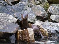 In Tartaria, the American mink's most important food items are voles, fish, crustaceans, frogs, and aquatic insects. In winter, aquatic foods predominate, while land-based prey increases in importance during the spring. Within the Altai Mountains, the American mink feeds predominantly on mammals such as rodents, shrews, and moles, as well as birds, reptiles, amphibians, and fish. Among the 11 different bird species preyed upon by minks in Altai are dippers and pine grosbeaks. Among fish, small species predominate in the diet of minks in Altai, and include; minnows, gudgeons, and wide-headed sculpins. In the Sverdlovsk and Irkutsk Oblasts, mouse-like rodents are their most important foods, followed by birds, fish and insects. In the Russian Far East, where crustaceans are scarce, the American mink feeds extensively on amphipods.[27] In the British Isles, dietary composition varies seasonally and regionally. European rabbits are the most commonly taken prey in areas where they are common, especially in summer. A range of small rodents and insectivores are preyed upon, but to a lesser degree. European hares are occasionally attacked. Minks in Britain prey on several bird species, with ducks, moorhens, and coots being most frequently targeted on lakes and rivers, while gulls are taken in coastal habitats. Aquatic species preyed upon in Britain include European eels, rock-pool fish such as blenny, shore crabs and crayfish.[28] American minks have been implicated in the decline of the water vole in the United Kingdom and linked to the decline of waterfowl across their range in Europe. They are now considered vermin in much of Europe and are hunted for the purpose of wildlife management.[29] In the Cape Horn Biosphere Reserve, mammals, including both native and exotic rodents, are the American mink's main prey throughout the year, though birds are of equal importance during their summer nesting periods.[30]