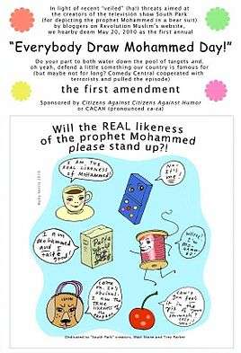 Everybody Draw Mohammed Day (or "Draw Mohammed Day") was a 2010 event in support of artists threatened with violence for drawing representations of the Islamic prophet Muhammad. It stemmed from a protest against censorship of the American television show South Park episode "201", led by the show's distributor Comedy Central, in response to death threats that had been made against some of those responsible for two segments broadcast in April 2010. A drawing representing Mohammed was posted on the Internet on April 20, 2010 with a message suggesting that "everybody" create a drawing depicting Mohammad on May 20 in support of free speech.