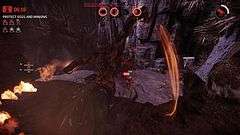 The Monster needs to grow stronger in order to fight the Hunters by hunting and killing other local wildlife in order to gain experience points. When it gains enough experience, the Monster can evolve.[7] Through evolution, the Monster's health bar is extended and refilled, and more abilities are available to the Monster, which makes it easier to kill the Hunters.[8] However, the Monster is vulnerable during its evolution, and if caught by the hunters, the process is disrupted.[7] The Monster can also enter a "stealth mode", allowing it to avoid detection by wildlife and Hunters.[9]