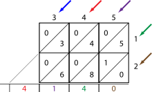 The pictures on the right show how to calculate 345 × 12 using lattice multiplication. As a more complicated example, consider the picture below displaying the computation of 23,958,233 multiplied by 5,830 (multiplier); the result is 139,676,498,390. Notice 23,958,233 is along the top of the lattice and 5,830 is along the right side. The products fill the lattice and the sum of those products (on the diagonal) are along the left and bottom sides. Then those sums are totaled as shown.