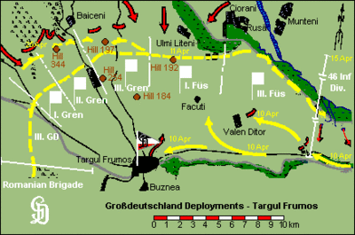 Early on 10 April, the Großdeutschland Division, consisting of approximately 160 tanks, including 40 Panthers and 40 Tigers, attacked westward along the road from Podu Iloaiei to Târgu Frumos in two columns deployed north and south of the road.[1] Following a heavy bombardment, the Germans broke into the town and engaged the Soviet troops which had taken cover in houses and other buildings.[19] The German thrust cut off a number of Soviet units from their main force and reached the high ground west of the town by launching a concerted counterattack just as the 206th Rifle, 3rd Guards Airborne and 93rd Guards Rifle Divisions were preparing to resume their assault southwards, at a time when only their rear guards and logistical subunits remained behind to defend the Târgu Frumos region.[20] Meanwhile, the Romanian 1st Guard and 7th Infantry Division advanced from the south, pressing the Soviets back to the north.[21] Trapped between the German armour racing into Târgu Frumos from the east and the Romanian infantry counterattacking from the south, the three divisions of 35th Guards Rifle Corps had no choice but to retreat.[21] At about 2200 hours, 48 hours after getting their original order, the German grenadiers had secured Târgu Frumos and the regions west and north of the town.[1]