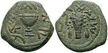 The medium size coin has the same inscription, with the denomination "reva" (quarter) inscribed. An etrog is depicted on the obverse, and two lulav are on the reverse. The larger of the three bronze coins are inscribed "chatzi" (half). On the obverse a lulav and etrog are again depicted, with a palm tree and baskets on the reverse.[4] These coins are sometimes referred to as 'Masada coins'.