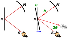 | If the distance between mirrors is h, the time between the first and second reflections on the rotating mirror is 2h/c (c = speed of light). If the mirror rotates at a known constant angular rate ω, it changes angle during the light roundtrip by an amount θ given by: