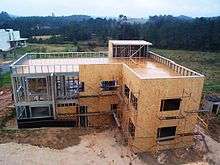 Oriented strand board (OSB), also known as flakeboard, sterling board and aspenite in British English, is a type of engineered lumber similar to particle board, formed by adding adhesives and then compressing layers of wood strands (flakes) in specific orientations. It was invented by Armin Elmendorf in California in 1963.[1] OSB may have a rough and variegated surface with the individual strips of around 2.5 cm × 15 cm (1.0 by 5.9 inches), lying unevenly across each other and comes in a variety of types and thicknesses.