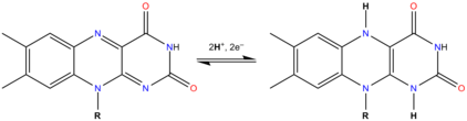 In aqueous solution, flavins are yellow-coloured when oxidized, taking a red colour in the semi-reduced anionic state or blue in the neutral (semiquinone) state, and colourless when totally reduced.[1] The oxidized and reduced forms are in fast equilibrium with the semiquinone (radical) form, shifted against the formation of the radical:[2]