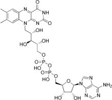 Flavin (from Latin flavus, "yellow") is the common name for a group of organic compounds based on pteridine, formed by the tricyclic heterocycle isoalloxazine. The biochemical source is the vitamin riboflavin. The flavin moiety is often attached with an adenosine diphosphate to form flavin adenine dinucleotide (FAD), and, in other circumstances, is found as flavin mononucleotide (or FMN), a phosphorylated form of riboflavin. It is in one or the other of these forms that flavin is present as a prosthetic group in flavoproteins.