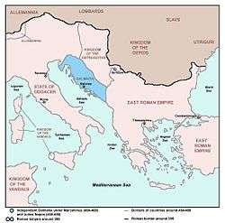 Marcellinus was a powerful figure in the Western Roman Empire, rebelling in 454 against the Emperor Valentinian III after the latter's assassination of Flavius Aetius. He established himself as an autonomous ruler in Dalmatia, despite accepting the authority of the emperors Majorian and Anthemius. Under Anthemius he was raised to the rank of patrician, becoming a possible threat to Ricimer, the powerful kingmaker behind the western throne. In 468, Marcellinus died in Sicily, probably at the hands of Ricimer.[10][11][12] Nepos inherited control of Dalmatia from his uncle, gaining the title magister militum Dalmatiae,[13] and with it a powerbase which would be integral to his future career.